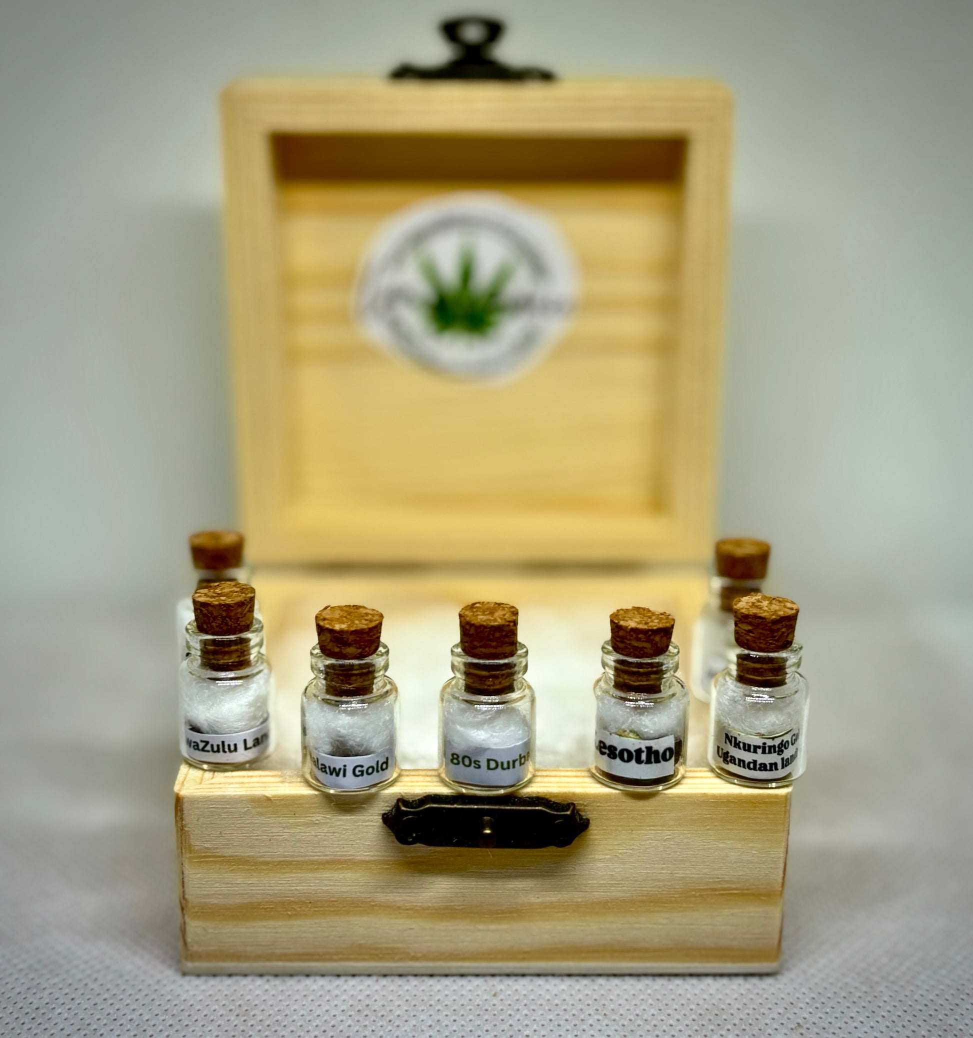 Inside this beautifully crafted wooden box, you’ll find 7 of Africas rarest landrace strains plus one secret surprise strain that hasn’t yet been released on our website, making this collection a true treasure for cultivators, collectors, and connoisseurs alike.